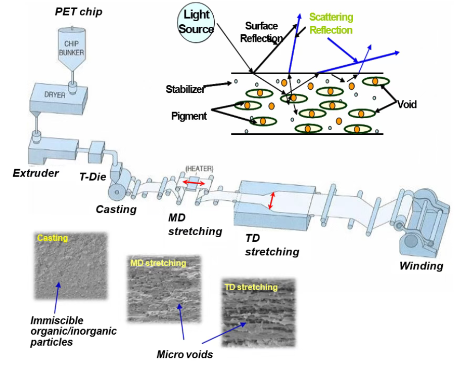 Principle: Incorporating incompatible resins or particles into the PET substrate, followed by biaxial stretching to form a uniform microporous structure, achieving high reflectivity.