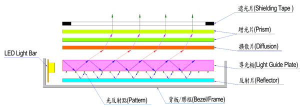 The edge-lit structure features light sources positioned along the sides, employing injection-moulded light guides without printed circuits. This design is suitable for small-sized backlight modules under 18 inches, offering advantages such as lightweight construction, slim profiles, narrow bezels, and low energy consumption. It is commonly used in backlight modules for mobile phones, personal digital assistants (PDAs), and notebook computers. Additionally, edge-lit structures can be applied to large-sized backlight modules.