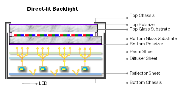 Direct-lit structures are suitable for ultra-large backlight modules. Characterized by the absence of a light guide plate, the light source is positioned directly beneath the panel. Advantages include high brightness, excellent viewing angles, high light utilization efficiency, and simplified structure. This configuration is appropriate for LCD monitors and televisions where portability and space constraints are less critical. However, drawbacks include high energy consumption, poor uniformity, and potential LCD overheating.